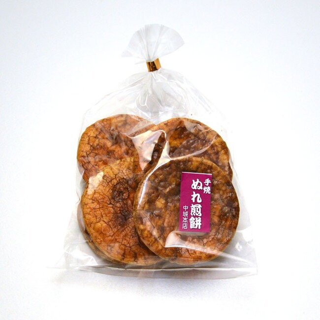 ぬれせん 5枚入り。あえて表面のみに醤油を染み込ませるこで、外はしっとり、芯はパリと焼き上げた、少し堅めのぬれ煎餅。お手頃な5枚入り。中城本店の大人気商品です。