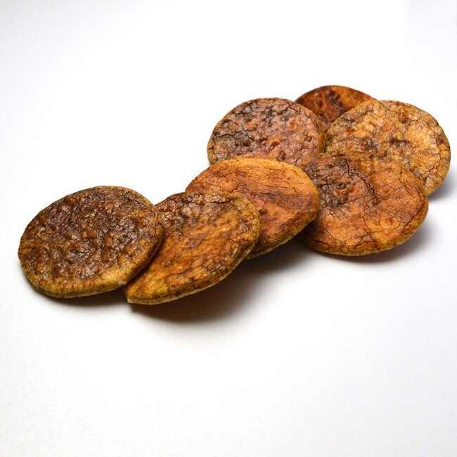 職人さんの手により、こんがりときつね色になるまで焼き、まだ熱いうちに特製のお醤油にサッと漬け込みます。 当店独自の漬け具合で表面だけが濡れ、中はサクッとした食感の堅めの、ぬれせんべいになっております。